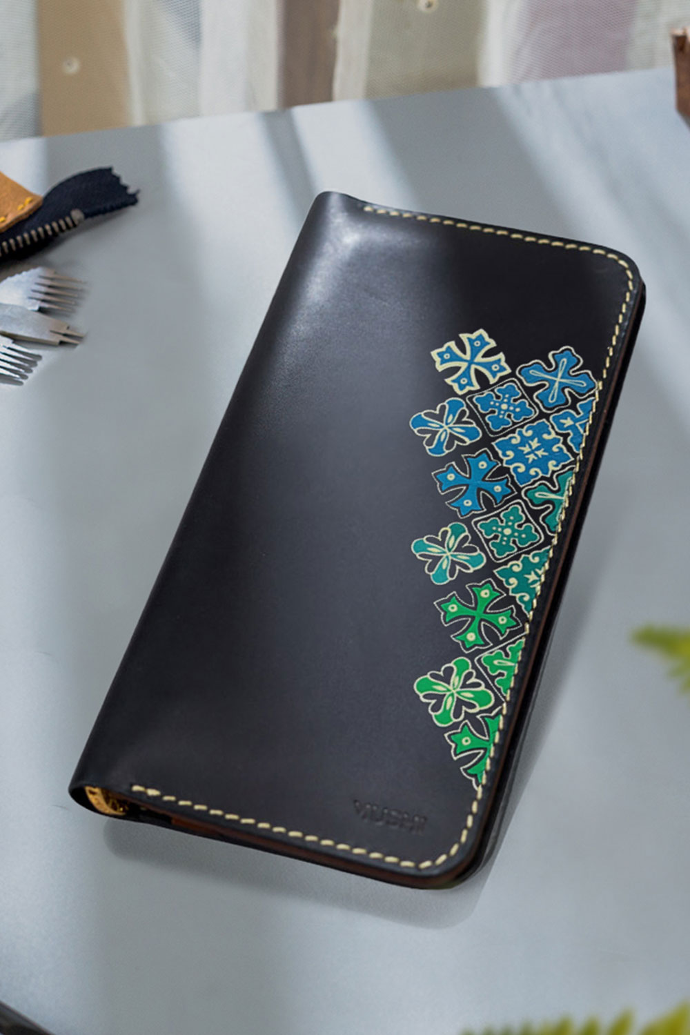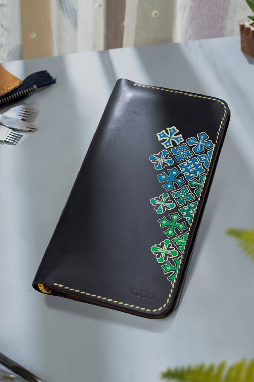 Handcrafted leather wallet with green and blue design.