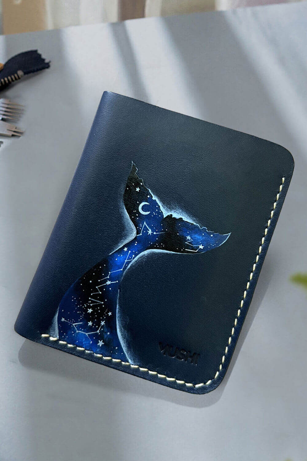A whale, made of stars and soft lines, floats across a deep blue wallet like a dream from the ocean or the sky. Its shape feels timeless, like it’s been swimming through stories and constellations forever.